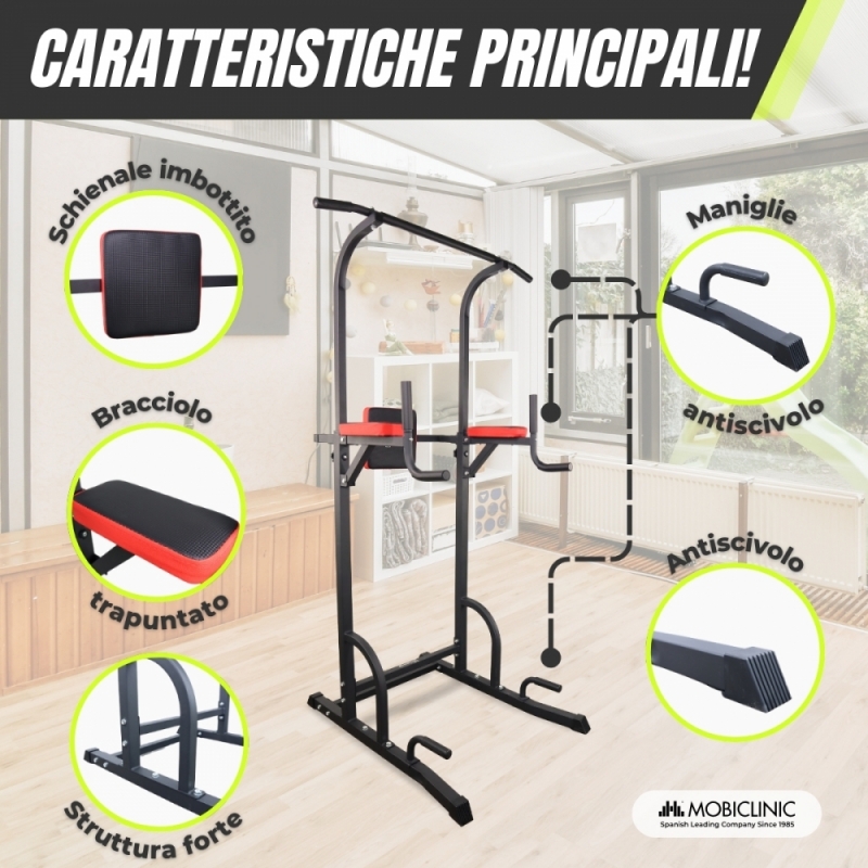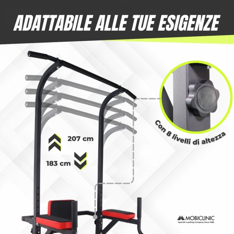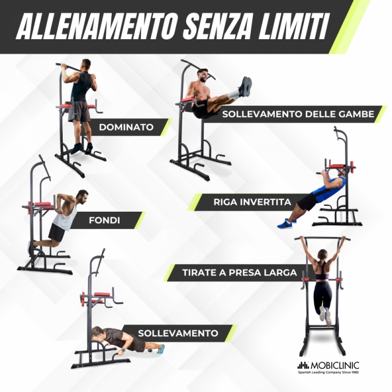 L'attrezzatura MultiFit è una stazione per trazioni che offre un'ampia varietà di esercizi per un allenamento completo. È un "tutto in uno" per esercitare sia la parte superiore che inferiore del tronco e tonificare gli addominali e le spalle, tra le altre parti del corpo. Le sue molteplici funzioni apportano notevoli benefici per perdere peso velocemente e facilmente o rafforzare i muscoli della schiena per correggere e migliorare la postura.
