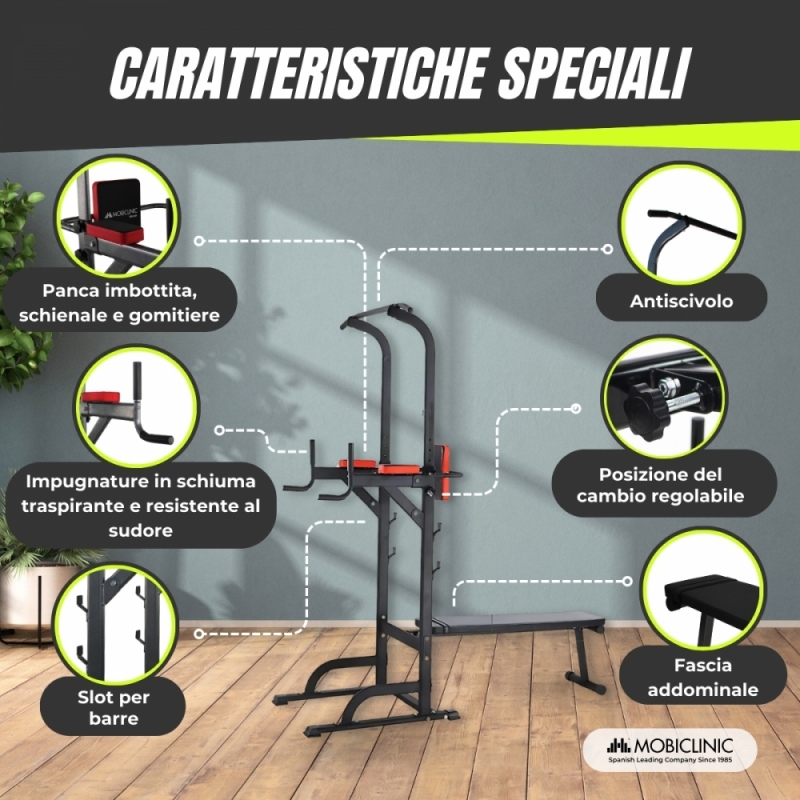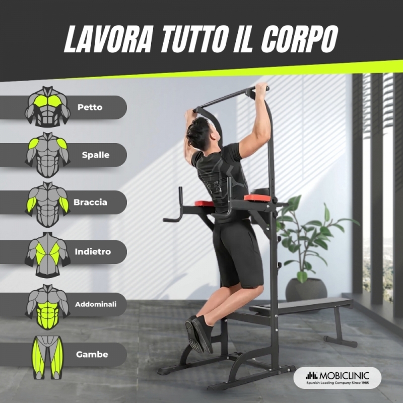 Le impugnature ergonomiche antiscivolo consentono una presa comoda, evitando posture scorrette che potrebbero danneggiare i polsi. Inoltre, lo schienale fornisce ulteriore supporto per esercizi come il sollevamento delle gambe, garantendo una pratica più sicura ed efficiente. Con dimensioni pieghevoli, questa stazione è facile da riporre e trasportare , rendendola un'opzione ideale per chi desidera una palestra a casa senza occupare troppo spazio.