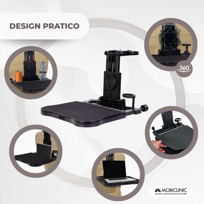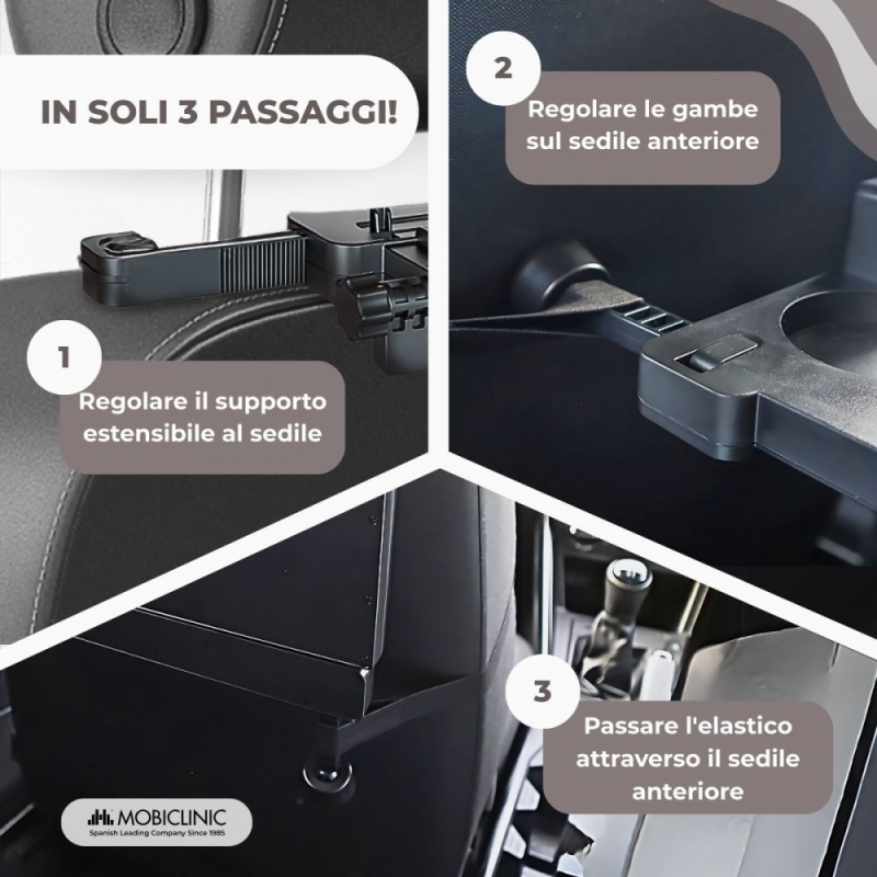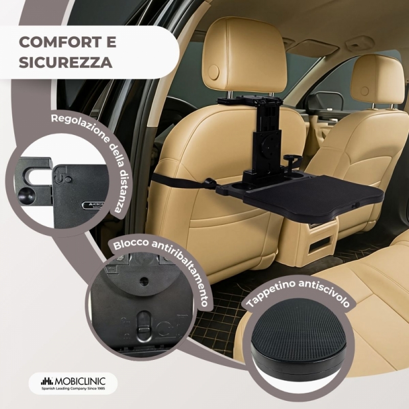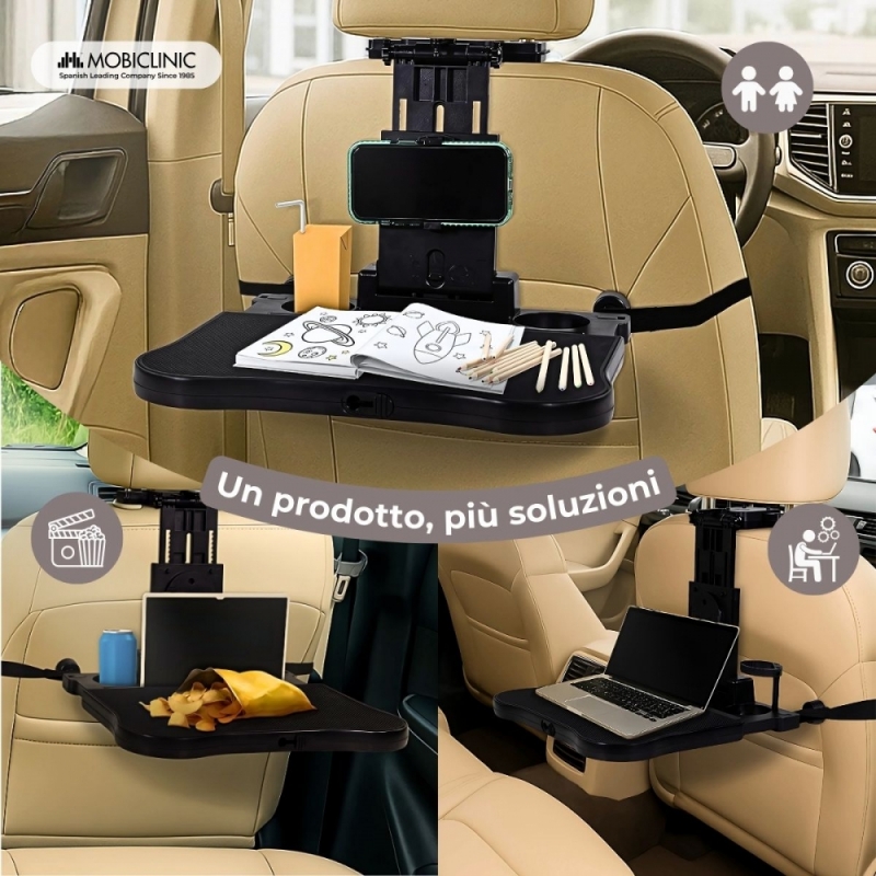 COMPLEMENTOS: Il tavolino Staycar è dotato di pratici accessori che migliorano l'esperienza durante il viaggio. Include anche un gancio per cellulare a 360º che permette di posizionare il dispositivo in posizione verticale o orizzontale e uno slot appositamente progettato per un tablet, offrendo un fissaggio sicuro e stabile durante il viaggio per poterlo utilizzare comodamente.