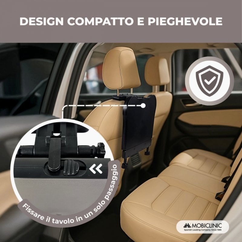 REGOLABILE E PIEGHEVOLE: Grazie ai suoi supporti regolabili, il vassoio ausiliario si fissa perfettamente allo schienale del sedile, garantendo stabilità e adattandosi a diversi modelli di sedile. Inoltre, il suo design pieghevole permette di chiuderlo facilmente quando non viene utilizzato, risparmiando spazio. Dispone inoltre di un sistema di bloccaggio che garantisce che si chiuda correttamente una volta piegato, offrendo maggiore sicurezza.