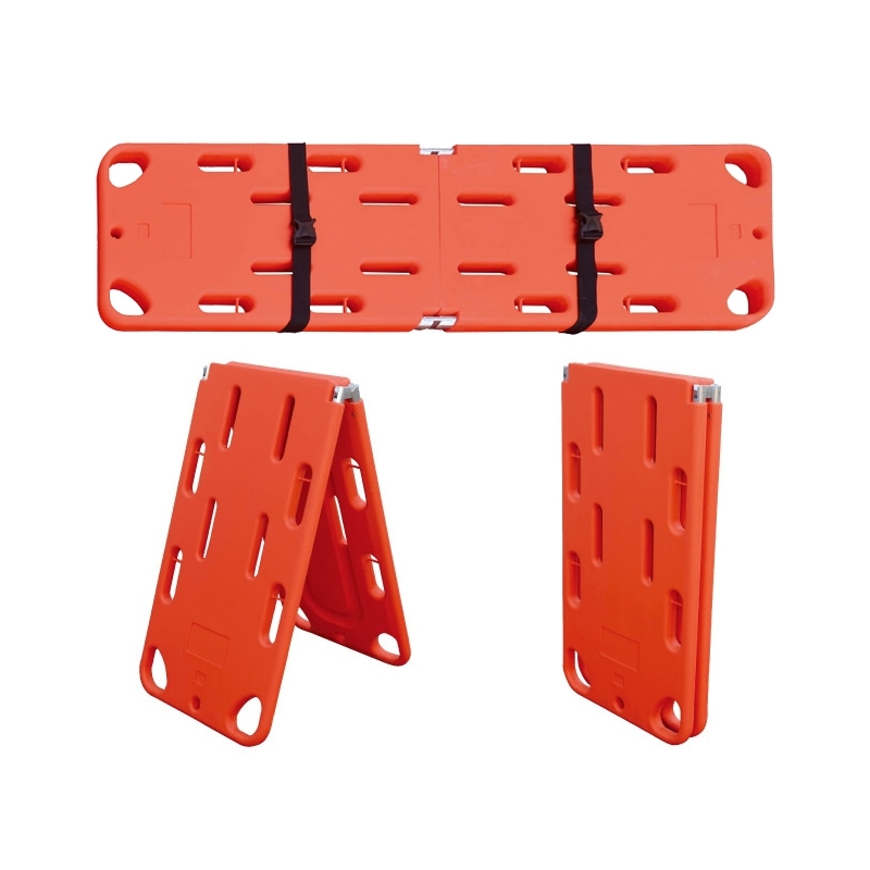 Tavola spinale pieghevole in polietilene. Struttura solida che facilita il trasporto. Consente l'uso dei raggi X. Due cinghie assicurano che il processo di trasporto sia sicuro. Galleggiante.