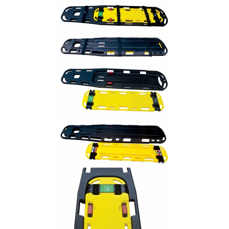 Tavola spinale 2 in 1, per adulti e pediatrica, realizzata in polietilene ad alta densità (HDPE). Struttura solida, facile da trasportare. Completamente impermeabile. Ottimizza lo spazio. Include una tavola spinale pediatrica integrata nella sua struttura. Elevata resistenza agli urti e alla corrosione.