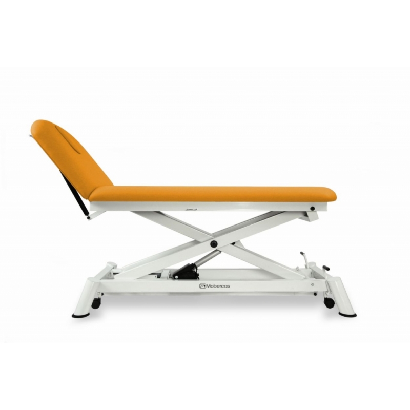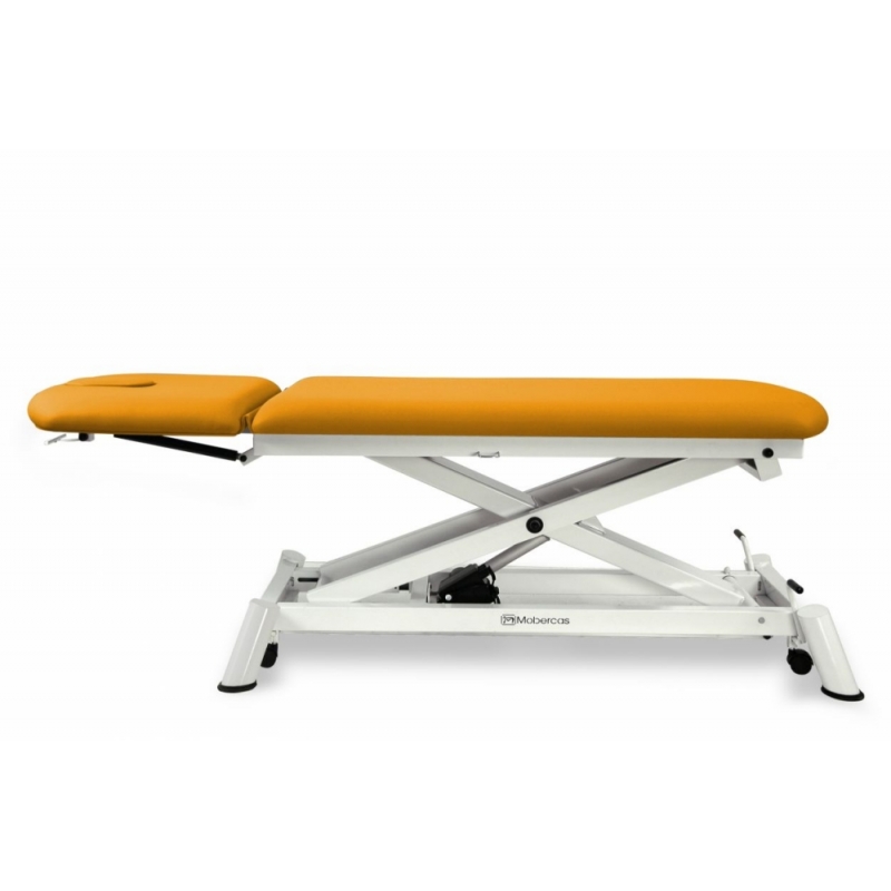 Lettino da visita elettrico a 2 sezioni con schienale reclinabile negativo, portarotolo, cuffia facciale e ruote a scomparsa.