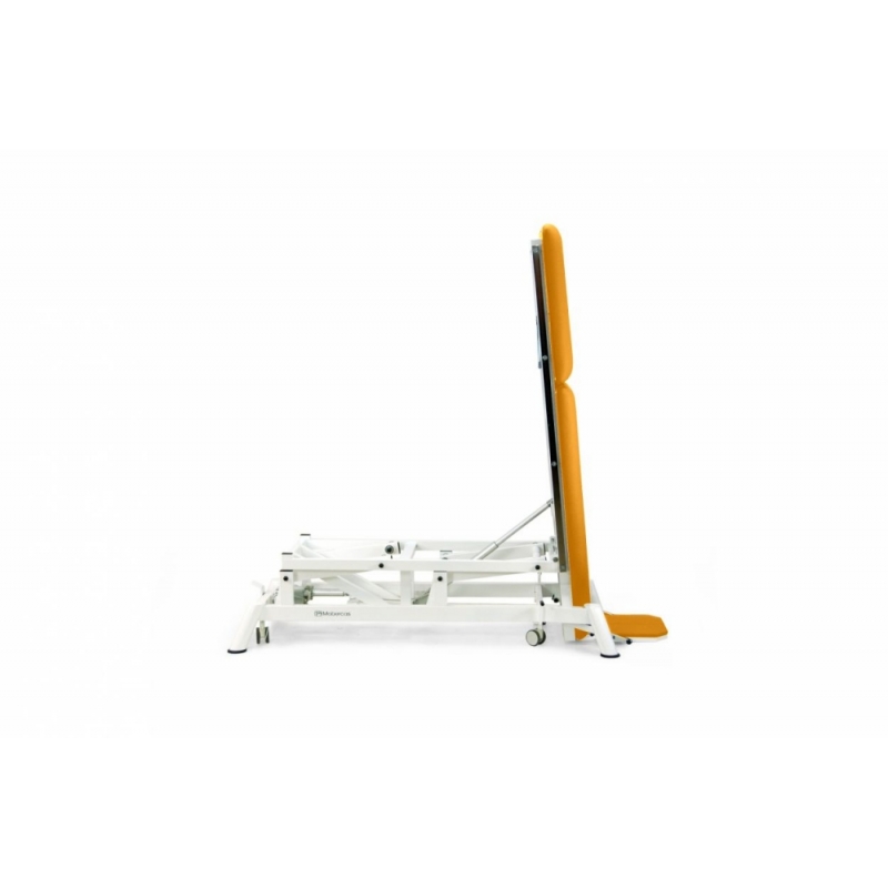Barella piana in piedi/inclinata per pediatria a 2 sezioni con altezza motorizzata e regolazione verticale, pedane indipendenti e regolabili (inclinazione/discesa), schienale regolabile, guide laterali per l'ancoraggio delle cinghie di fissaggio e accessori vari e ruote a scomparsa.