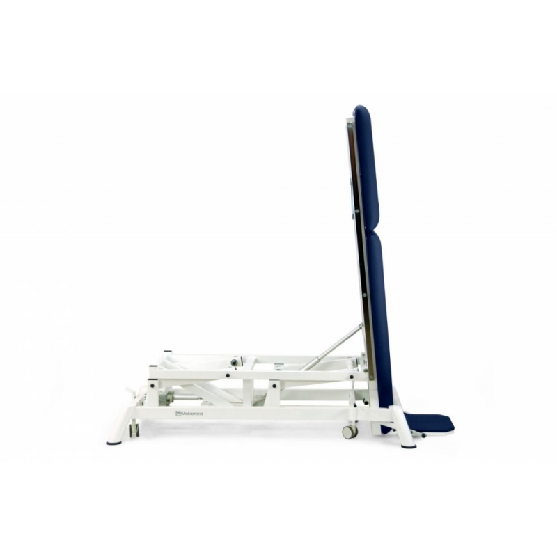 Barella piana in piedi/inclinata a 2 sezioni con altezza motorizzata e regolazione verticale, poggiapiedi indipendenti e regolabili (inclinazione/discesa), schienale regolabile, guide laterali per l'ancoraggio delle cinghie di fissaggio e accessori vari e ruote a scomparsa.