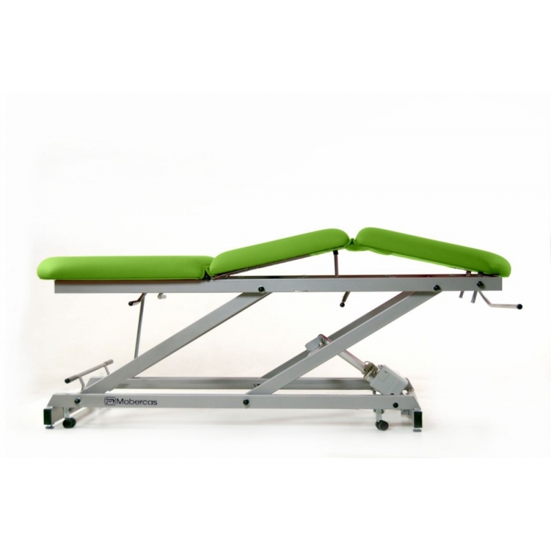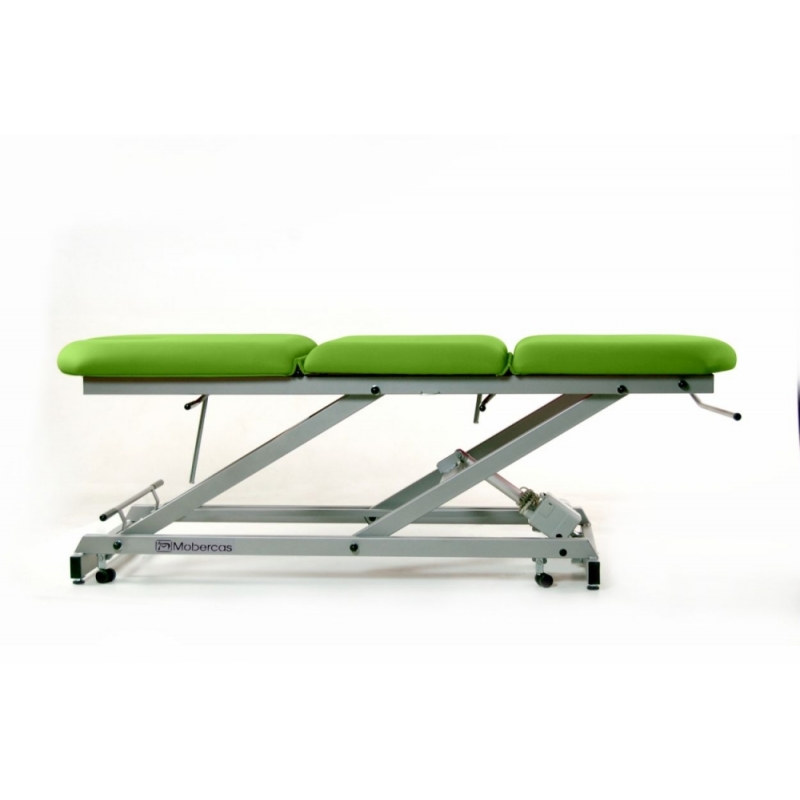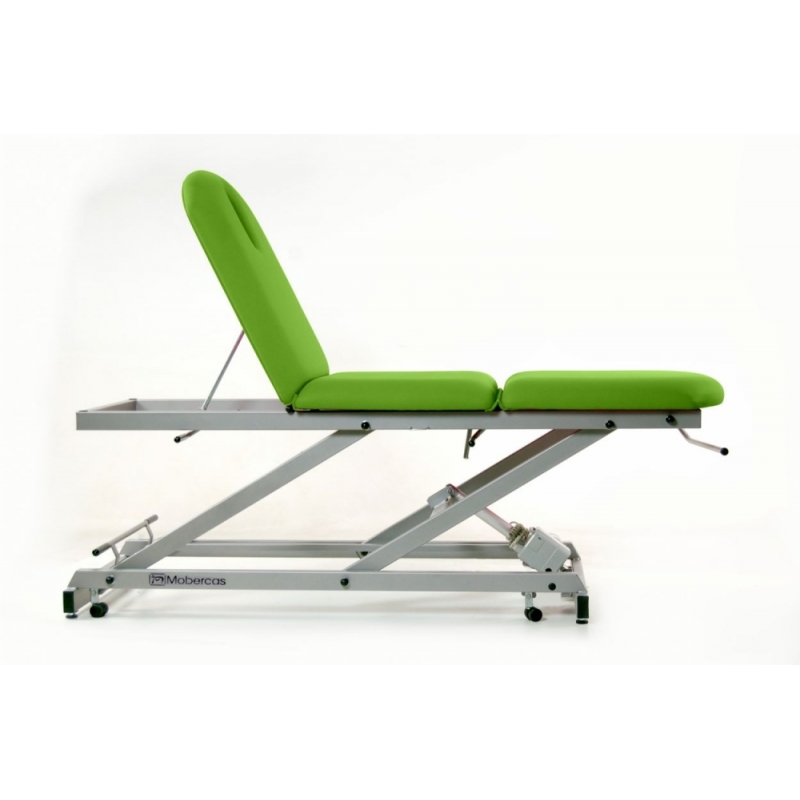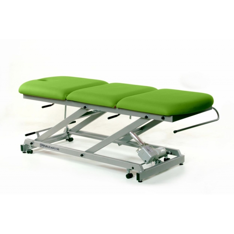 Barella da visita elettrica a 3 sezioni con piega centrale manuale, porta carta igienica, cuffia facciale e ruote a scomparsa.