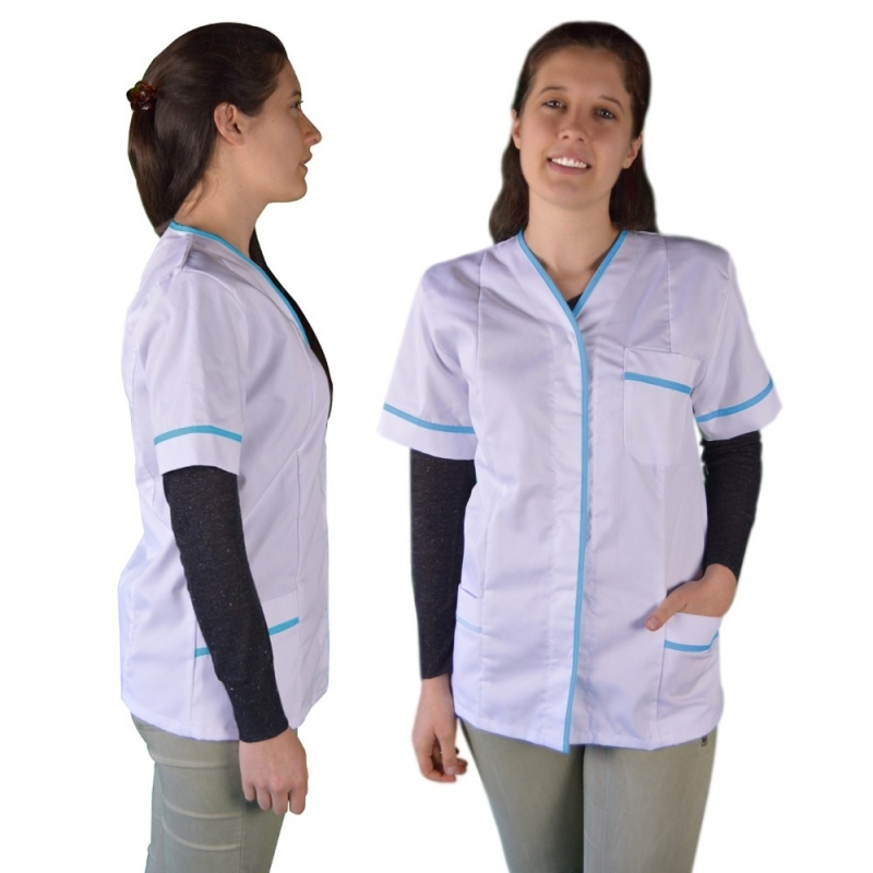 CARACTERÍSTICAS: se trata de una bata de color blanco con ribetes azules. El color blanco aporta serenidad y sus motivos color azul hacen que al mismo tiempo sea una bata actual para profesionales dinámicos. Se cierra mediante clips.