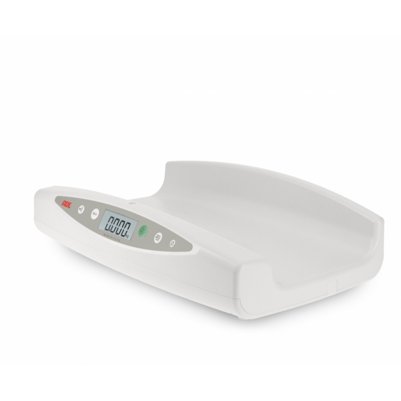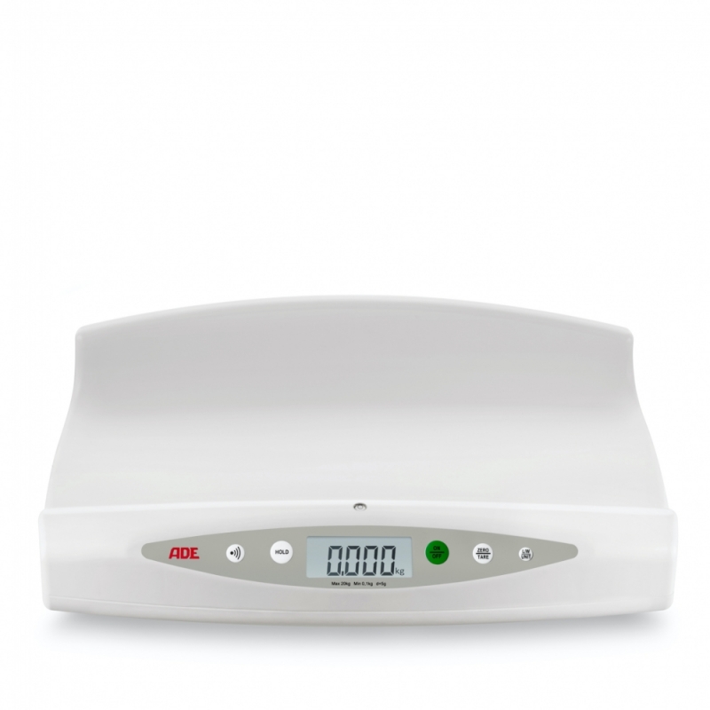 Bilancia di pesata per neonati progettata con un contorno liscio e una superficie sicura per i bambini piccoli e anche per bambini seduti. La precisa graduazione di 5 g su tutto il range di pesatura di 20 kg, insieme alla funzione di blocco automatico e un sistema di smorzamento elettronico garantiscono risultati di pesata rapidi e precisi.