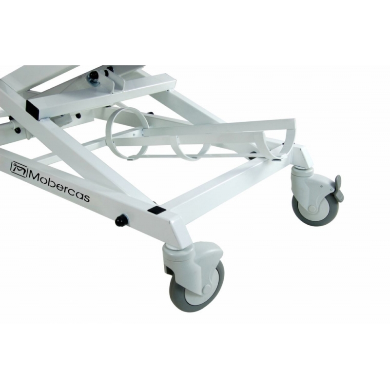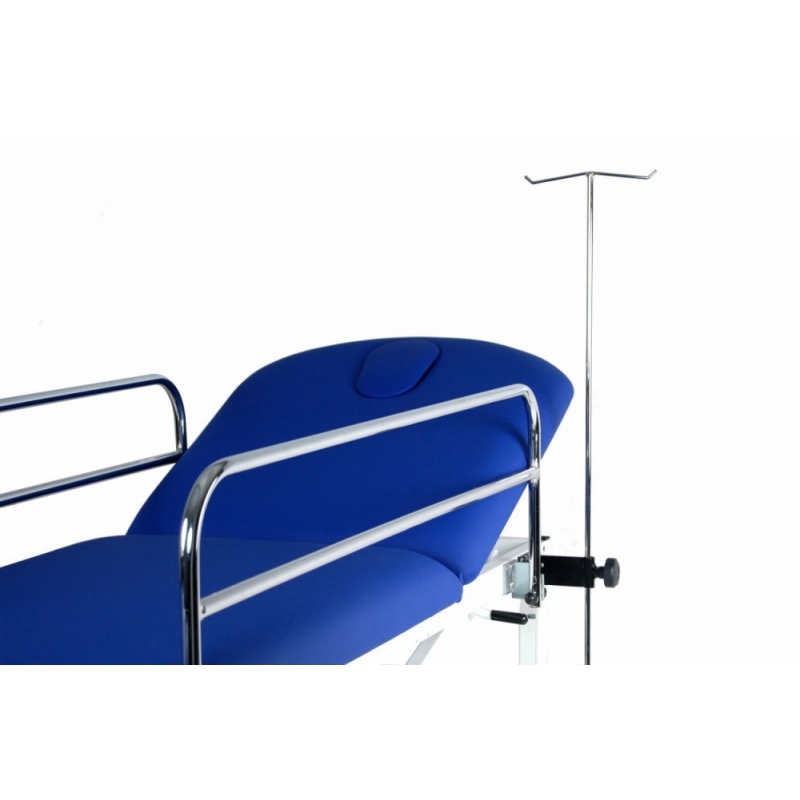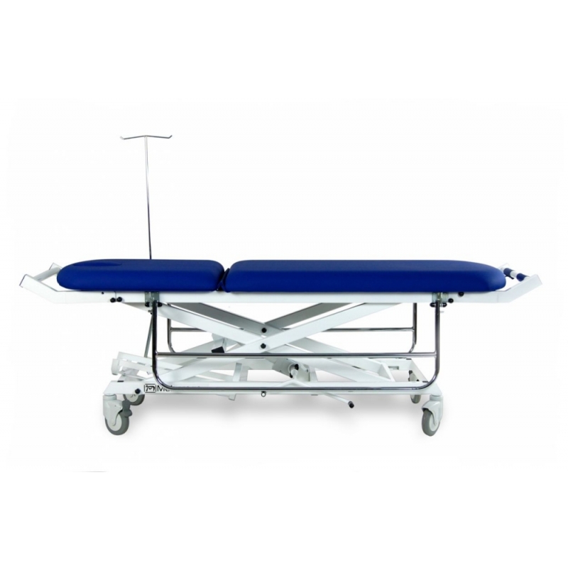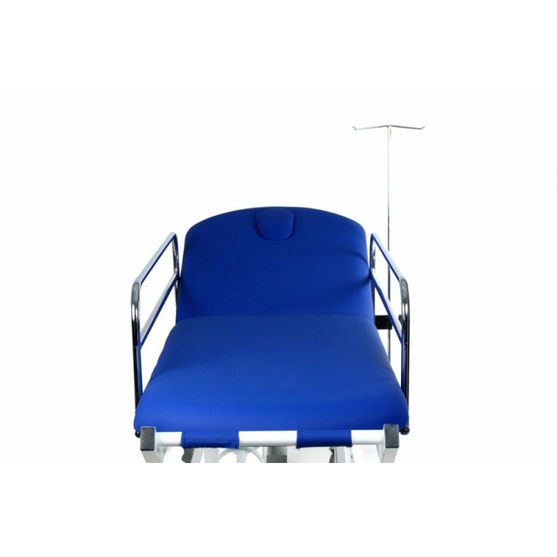 Carrello di trasferimento idraulico a 2 sezioni con ringhiere, aste portaflebo, portabottiglie, spingitori amovibili e pieghevoli (alla testa e ai piedi) e ruote di trasporto da 125 mm.