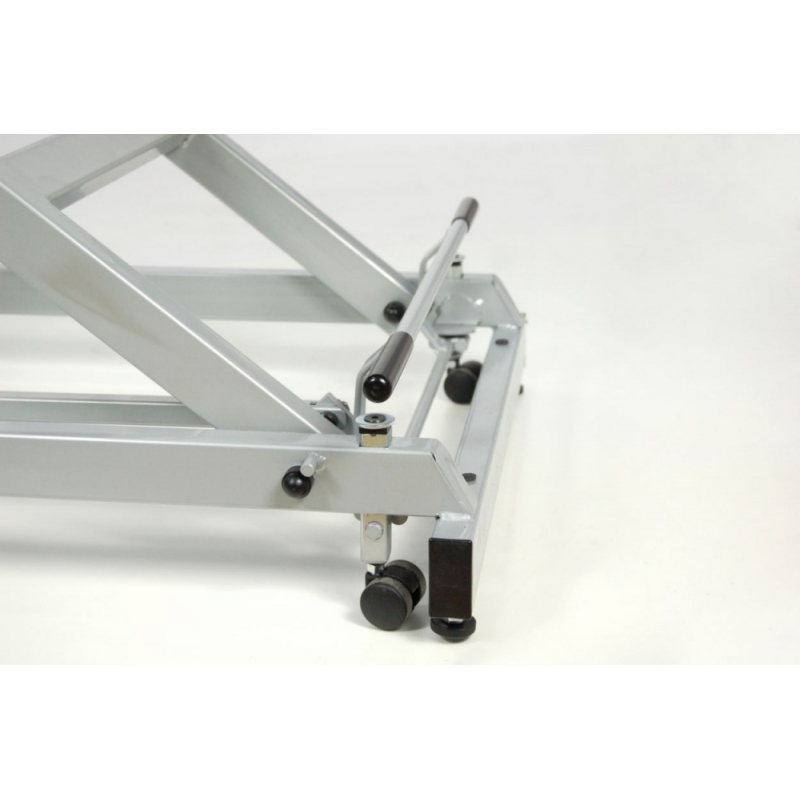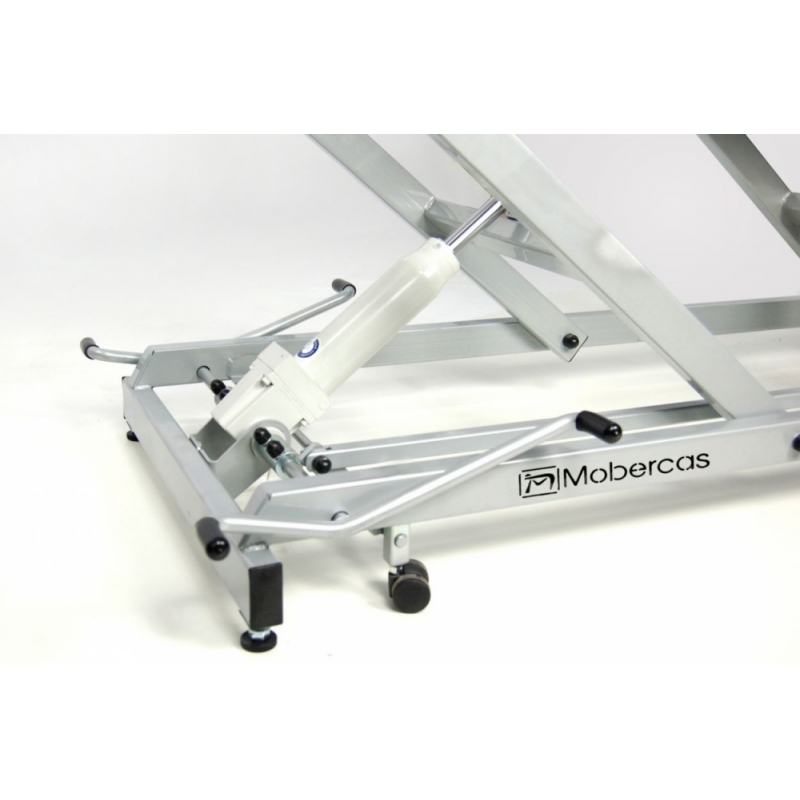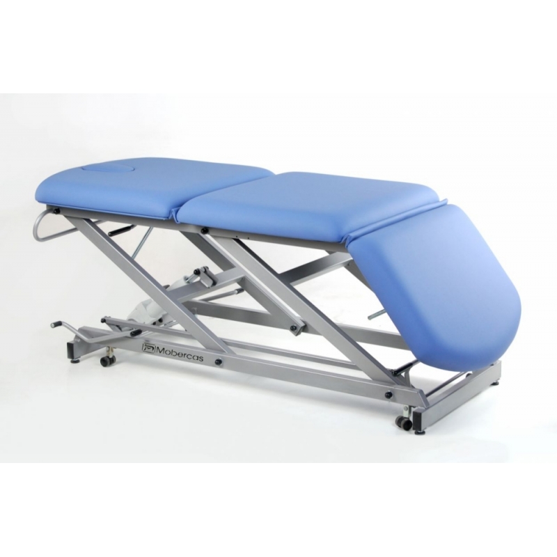 Barella idraulica tipo poltrona a 3 sezioni con portarotolo, calotta facciale e ruote a scomparsa.