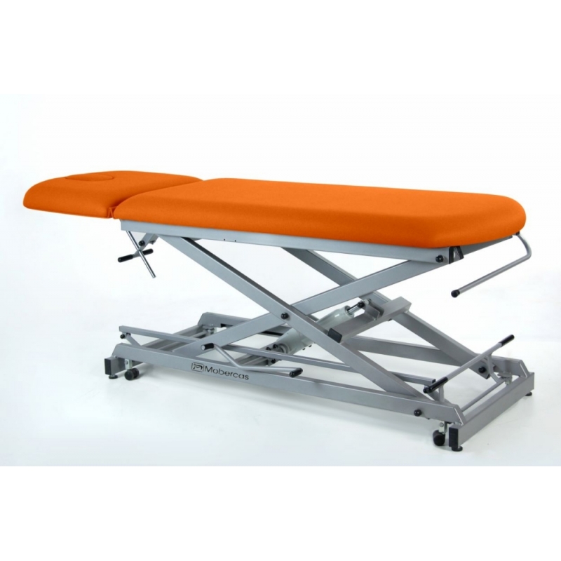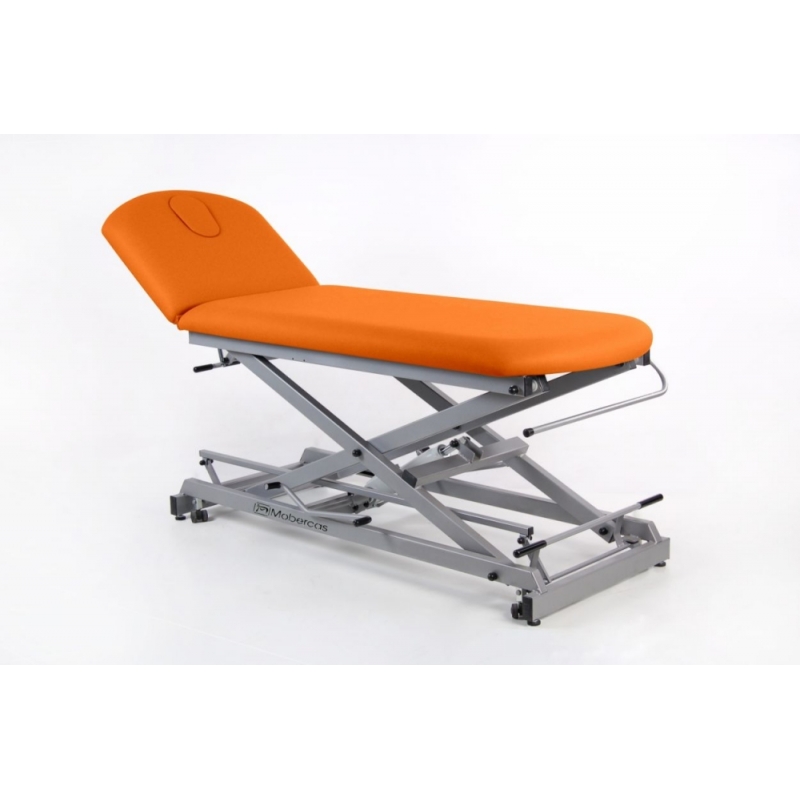 Lettino da visita idraulico a 2 sezioni con schienale reclinabile negativo e alzata dritta senza movimento laterale, portarotolo, cuffia facciale e ruote a scomparsa.