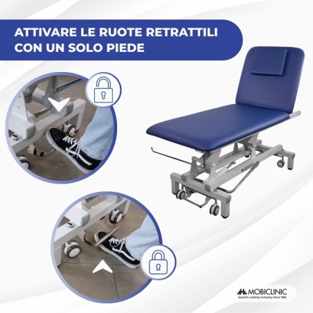 MOBILITÀ E STABILITÀ: Questa barella è dotata di quattro ruote retrattili da 7,62 cm che ne consentono un facile spostamento. Quando il sistema viene disattivato tramite pedale, la barella è saldamente fissata al pavimento. È inoltre dotata di livellatori su ogni gamba che garantiscono stabilità anche su pavimenti irregolari, garantendo la sicurezza dell'utente in ogni momento.