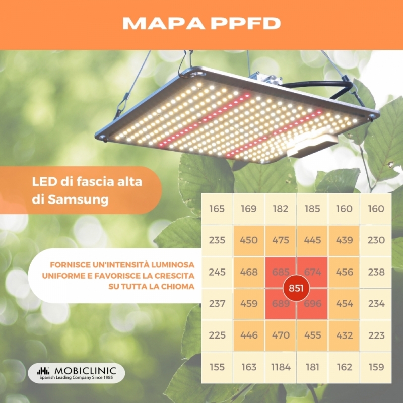 TECNOLOGIA ALL'AVANGUARDIA: La lampada da coltivazione Growlight è dotata della più recente tecnologia LED High End di Samsung. Fornisce un'intensità luminosa uniforme e favorisce la crescita su tutta la chioma. Scopri come la tecnologia all'avanguardia può trasformare la tua esperienza di crescita.