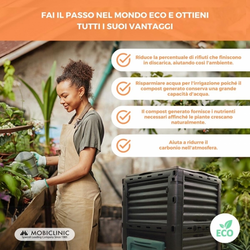 RISPARMIO ACQUA: Il funzionamento di BioBin consente un notevole risparmio di acqua per l'irrigazione, poiché il compost generato trattiene una grande capacità d'acqua che eviterà continui sprechi.