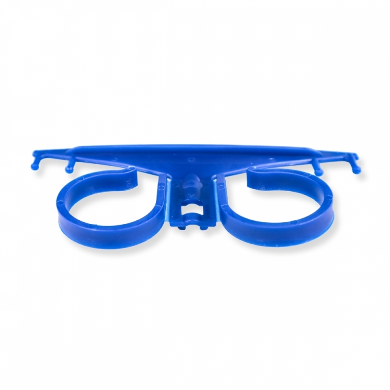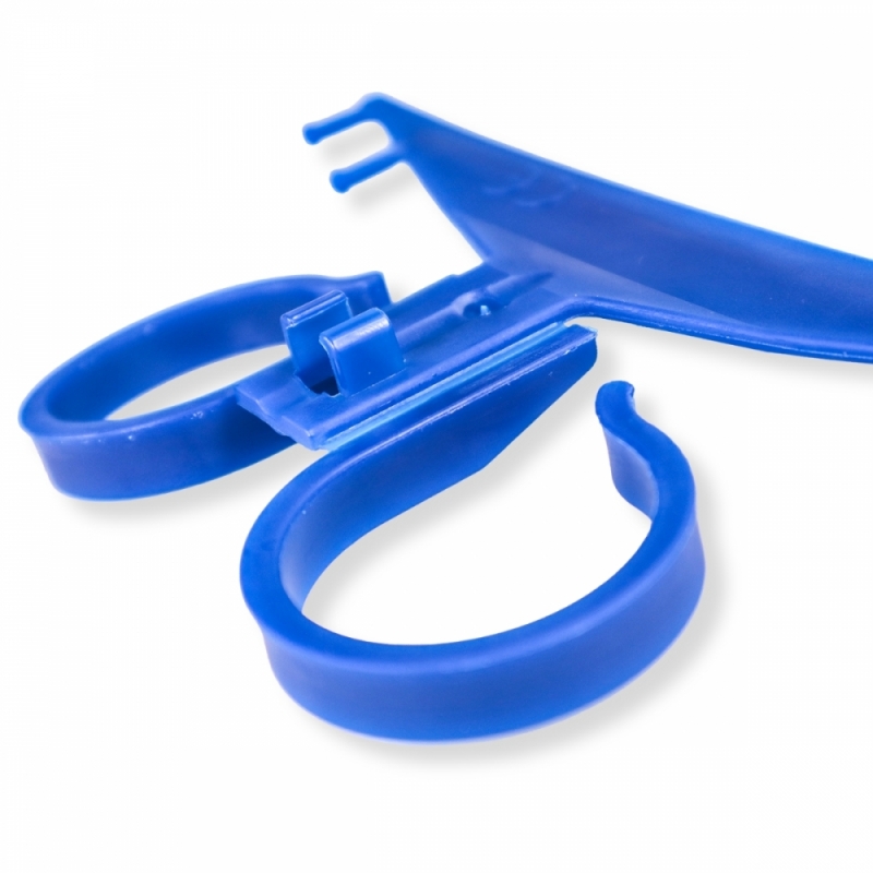 Supporto in plastica blu per appendere le sacche di urina per pazienti allettati sul lato del letto.