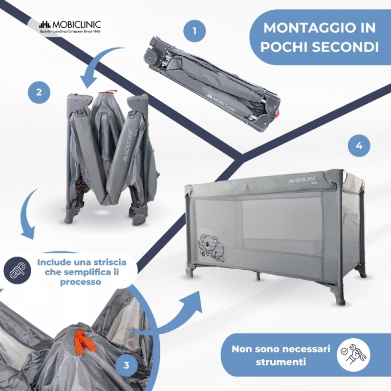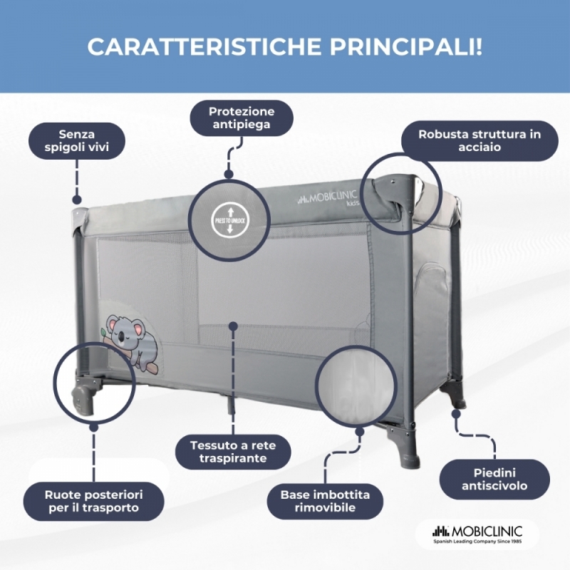 La culla portatile Mofli è composta da una resistente struttura in acciaio e da un tessuto traspirante che permette la piena visione del bambino, facile da pulire con un panno umido. Funziona come un box grazie alla sua altezza fissa e alla ventilazione ottimale attraverso la rete laterale. Inoltre, la sua facile piegatura contribuisce al fatto che può essere trasportato in qualsiasi spazio senza problemi se necessario. Include anche una base imbottita rimovibile.