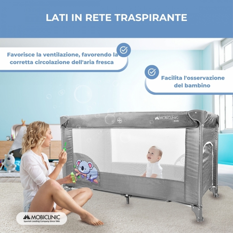 TRASPIRANTE: Il suo tessuto a rete consente una ventilazione ottimale e una visione completa del bambino in ogni momento per mantenerlo sorvegliato.
