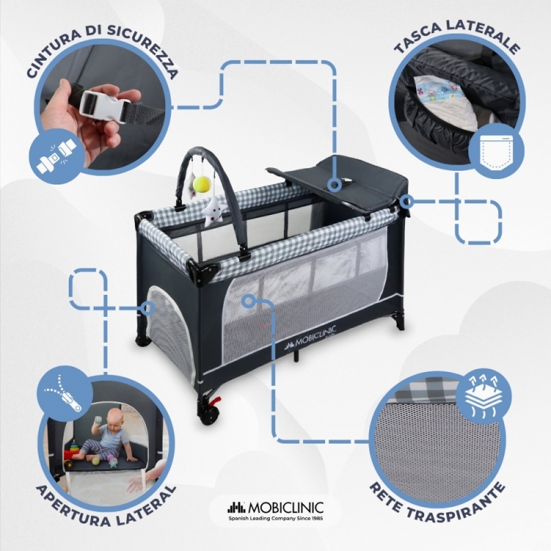 Il fasciatoio integrato include una cintura di sicurezza e una pratica tasca portaoggetti per tenere organizzati gli oggetti essenziali durante il cambio del pannolino. Inoltre, è dotato di un arco gioco che stimola lo sviluppo del bambino divertendosi. Il lettino si distingue anche per la sua facile piegatura, che ne facilita il trasporto e lo stoccaggio. Include una borsa per il trasporto, quindi è comodo da portare ovunque.