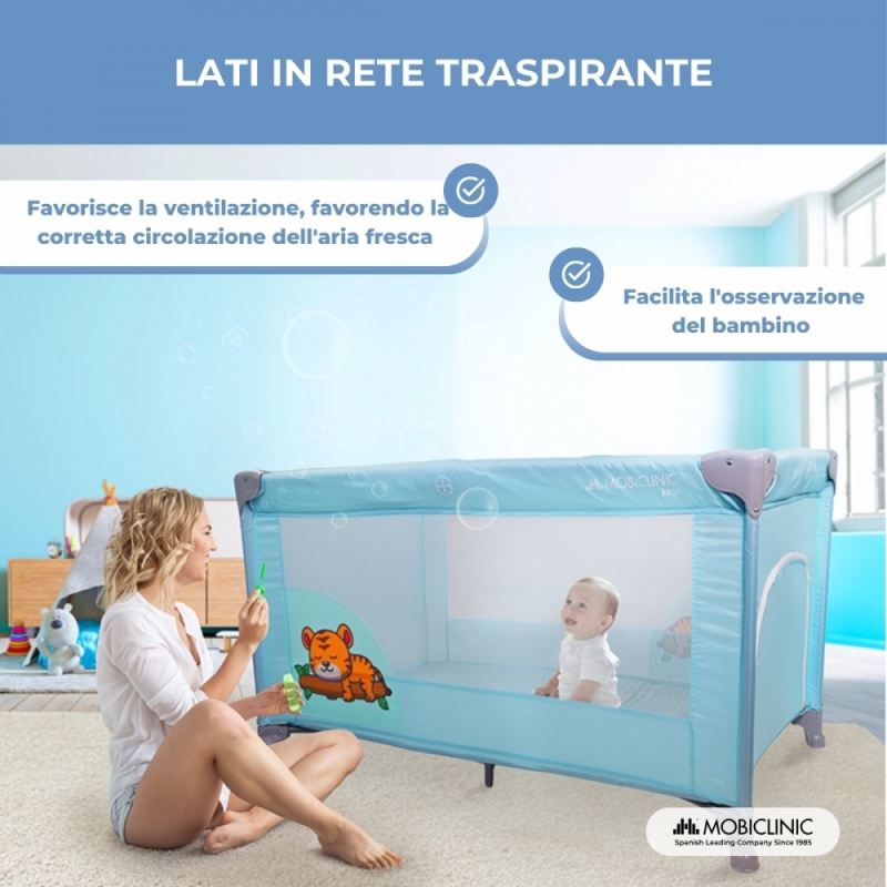 TRASPIRANTE: Il suo tessuto a rete consente una ventilazione ottimale e una visione completa del bambino in ogni momento per mantenerlo sorvegliato.