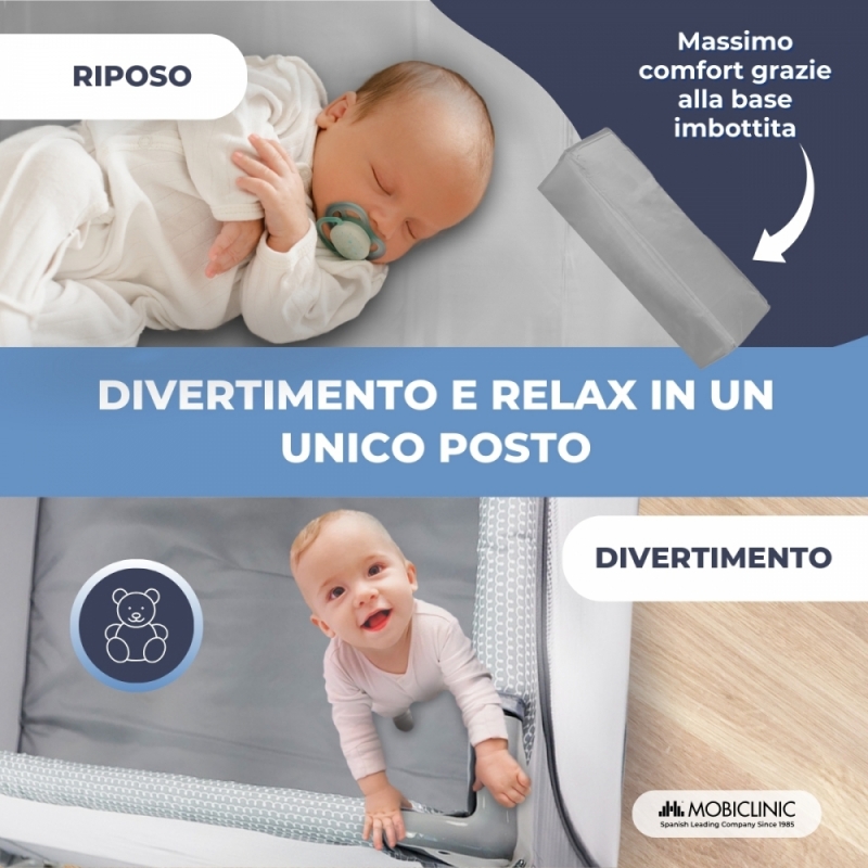 2 IN 1: questo parco giochi unisce funzionalità e comfort, fungendo da spazio sicuro per giocare e riposare. Il suo design multifunzione lo rende una soluzione pratica per le famiglie, poiché permette di alternare un'ampia area giochi a un comodo luogo dove riposare. Questo box massimizza l'utilizzo dello spazio senza compromettere la sicurezza o il comfort del bambino.