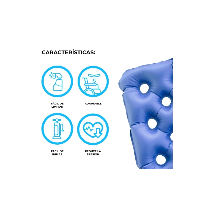 Questo tipo di cuscini gonfiabili funziona normalmente come seduta adattabile alle misure di sedie, poltrone o carrozzine. La sua funzione principale è quella di fornire supporto alle aree del corpo ferite con ulcere, come: piedi, orecchie, parte posteriore della testa, parte posteriore delle spalle, parte bassa della schiena, osso sacro, talloni, caviglie, gomiti e ginocchia.