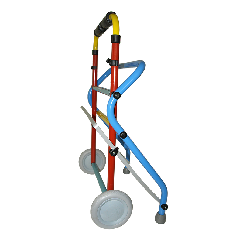 Deambulatore molto leggero e colorato, appositamente progettato per i bambini. È fatto di alluminio e termoplastica, è pieghevole e le maniglie sono regolabili in altezza.