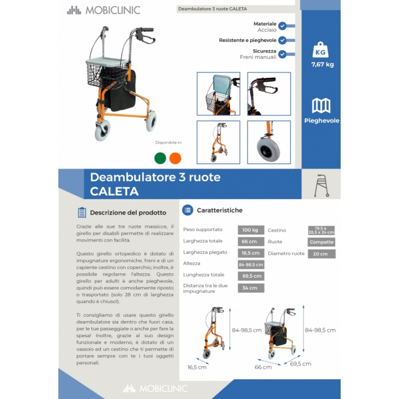Questo carrello per deambulare, modello Caleta, è consigliato per persone anziane, disabili o con mobilità ridotta o per persone che stanno facendo un percorso di riabilitazione. Grazie alle sue tre ruote massicce, il girello per disabili permette di realizzare movimenti con facilità.
