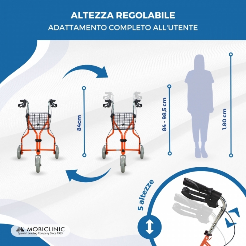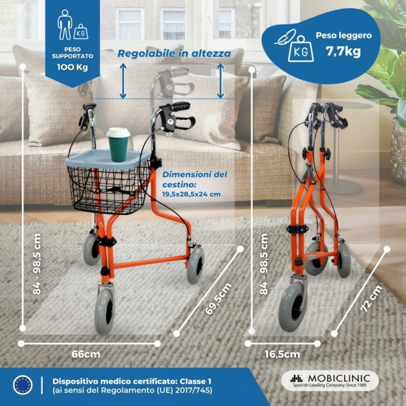 Questo girello ortopedico è dotato di impugnature ergonomiche, freni e di un capiente cestino con coperchio; inoltre, è possibile regolarne l'altezza. Questo girello per adulti è anche pieghevole, quindi può essere comodamente riposto o trasportato (solo 28 cm di larghezza quando è chiuso!).