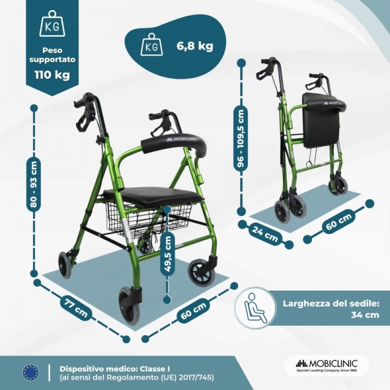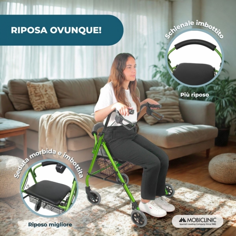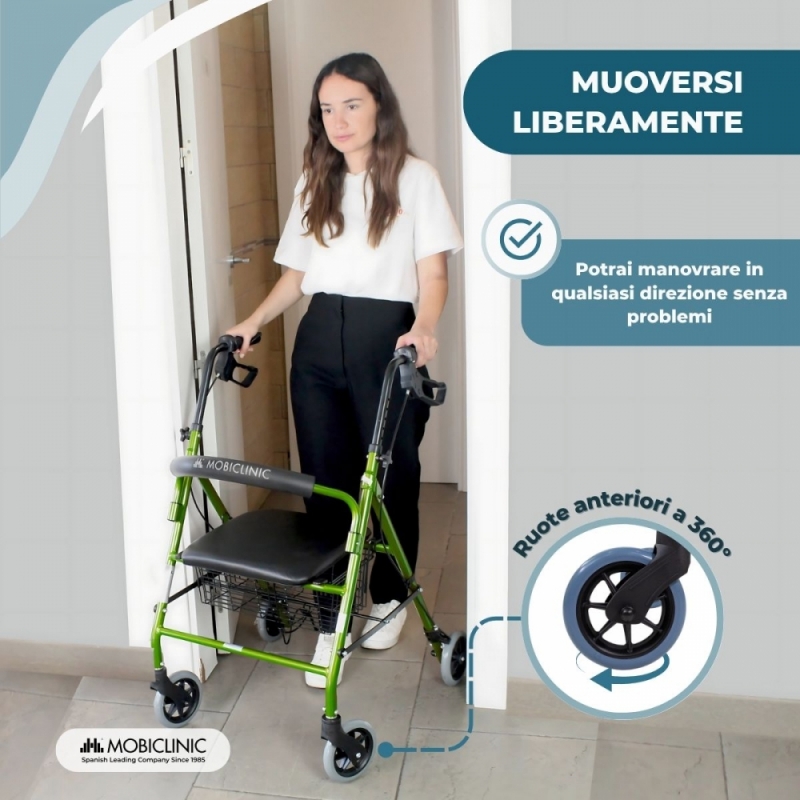 Si tratta di un deambulatore con ruote per anziani con un design innovativo e leggero, che offre un'eccellente mobilità e stabilità durante la deambulazione. È un deambulatore in alluminio che offre grande resistenza e agilità nei movimenti. Le sue quattro ruote massicce sono progettate per superare comodamente piccoli ostacoli, sia al chiuso che all'aperto, senza alcun rischio di forature.