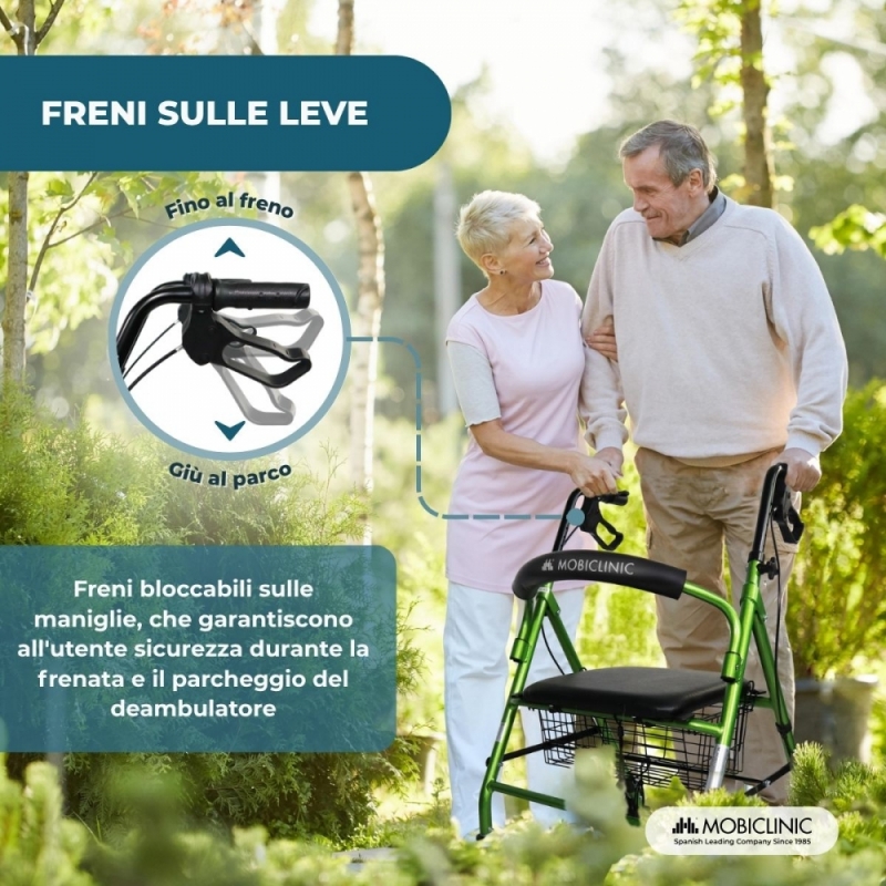 Le maniglie del deambulatore con ruote sono ergonomiche, aiutano a distribuire e ammortizzare il peso e riducono l'affaticamento durante l'uso. Inoltre, sono dotate di freni ad attivazione morbida per fermare il deambulatore a 4 ruote solo nel momento desiderato e senza sforzo, e offrono anche la possibilità di lasciarli bloccati per garantire l'immobilizzazione del deambulatore, ad esempio, quando si è seduti sul sedile. Se il girello per disabili deve essere completamente immobilizzato, le leve dei freni devono essere tirate verso il basso e le ruote bloccate.