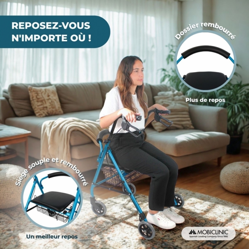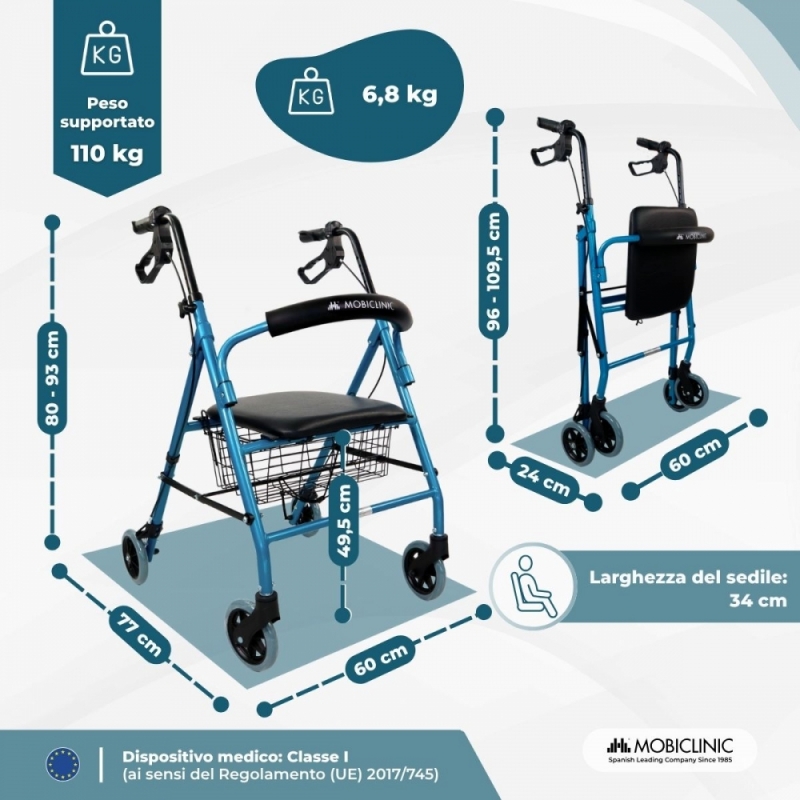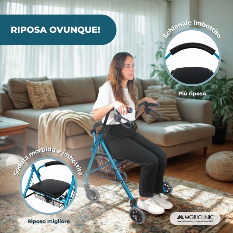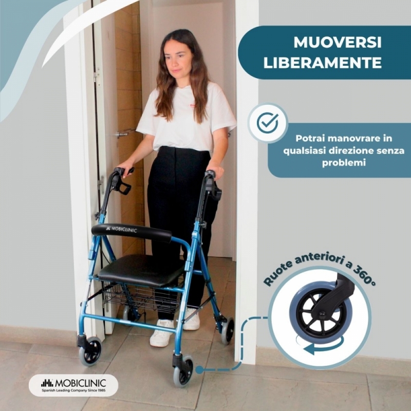 Si tratta di un deambulatore con ruote per anziani con un design innovativo e leggero, che offre un'eccellente mobilità e stabilità durante la deambulazione. È un deambulatore in alluminio che offre grande resistenza e agilità nei movimenti. Le sue quattro ruote massicce sono progettate per superare comodamente piccoli ostacoli, sia al chiuso che all'aperto, senza alcun rischio di forature.