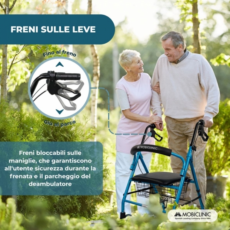 SICURO : i freni a mano e le impugnature ergonomiche si adattano, aiutando a distribuire e ammortizzare il peso durante la camminata, consentendo una migliore maneggevolezza del deambulatore.