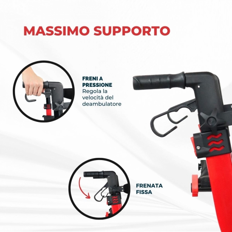 SICURO: Questo deambulatore per adulti è dotato di due tipi di freni facilmente azionabili esercitando pressione sulle maniglie o leve, entrambi di bloccaggio e di movimento per garantire grande sicurezza all'utente e prevenire possibili cadute