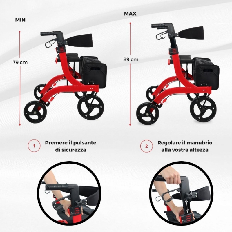 Per quanto riguarda il sistema frenante, è davvero semplice e utile per garantire la sicurezza dell'utilizzatore e prevenire possibili cadute. Per bloccare completamente il girello entrambe le leve dei freni devono essere premute verso il basso, mentre per frenare in movimento le leve dei freni devono essere premute verso l'alto. Inoltre, la sua altezza è regolabile di 10 cm tramite il manubrio per il comfort di ogni individuo.