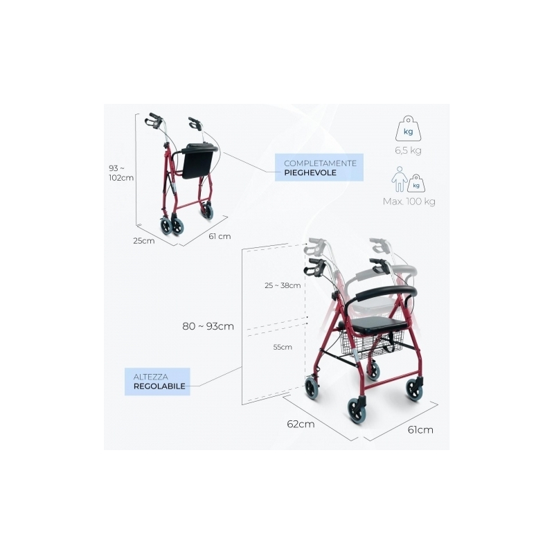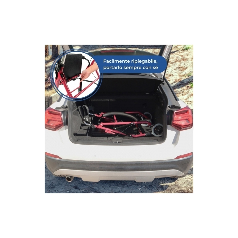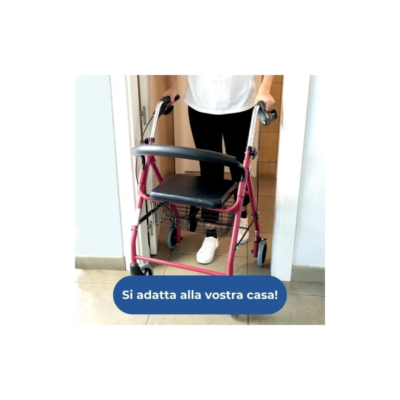 PORTE E BAGAGLIAIO : questo deambulatore ha una larghezza complessiva di 24" in modo che possa passare attraverso porte standard larghe 24". Inoltre, poiché questo deambulatore ripiegato misura solo 25 cm, può essere trasportato nel bagagliaio di un veicolo tipo Volkswagen Polo. Assicurati delle misure delle tue porte e del tuo veicolo per verificare che sia adatto a te.
