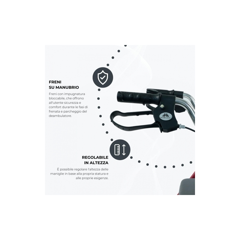 La sua impugnatura ergonomica che riduce l'affaticamento durante l'uso include freni ad attivazione dolce per fermare il deambulatore proprio nel momento desiderato e senza sforzo. Hai anche la possibilità di lasciare i freni bloccati per garantire l'immobilizzazione del deambulatore quando sei seduto o appoggiato.
