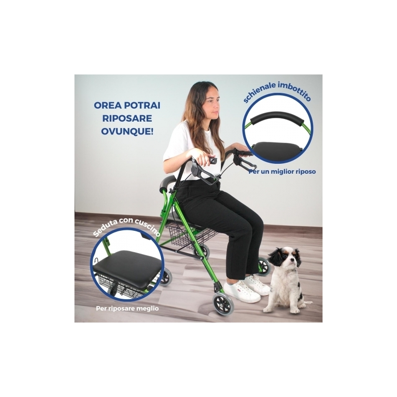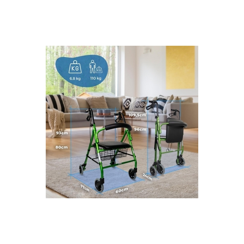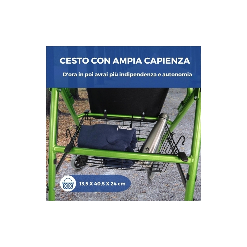 Questo deambulatore in alluminio è dotato di seduta e schienale imbottiti per garantire comfort e sicurezza, nonché un adeguato riposo dopo lo sforzo. Include un cestino progettato per riporre gli oggetti in modo sicuro e confortevole mentre cammini, potrai riporli sia sotto il sedile che nella parte anteriore del girello.