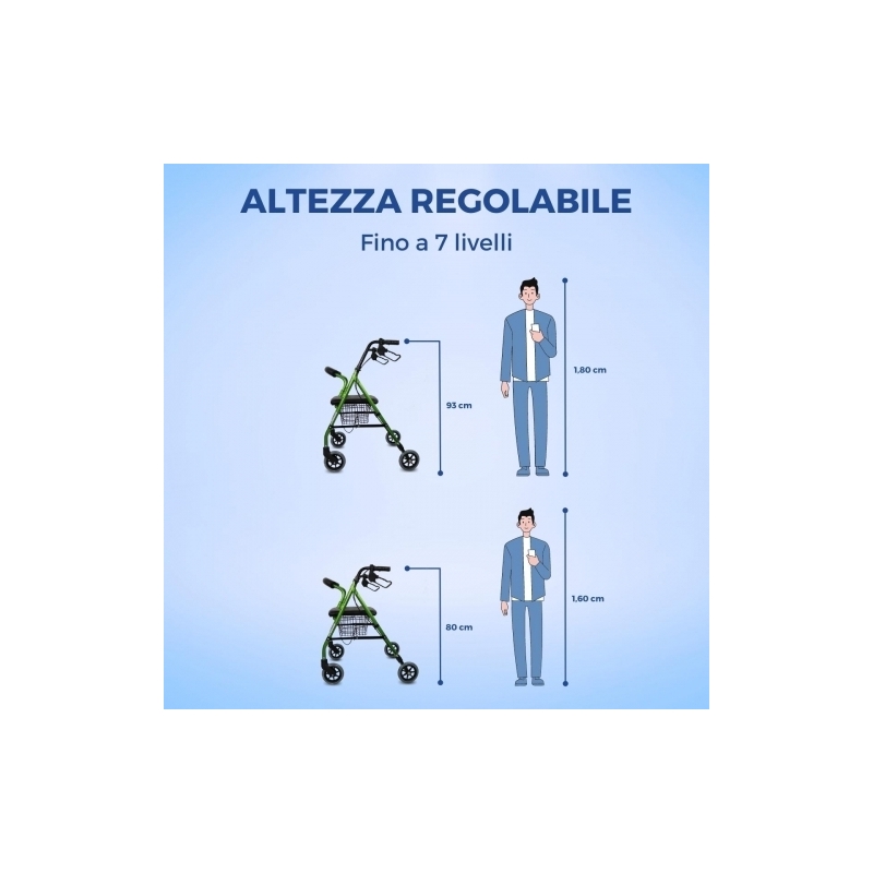 REGOLABILE: per garantire il massimo adattamento e comfort d'uso, questo deambulatore è regolabile in base all'altezza dell'utente.