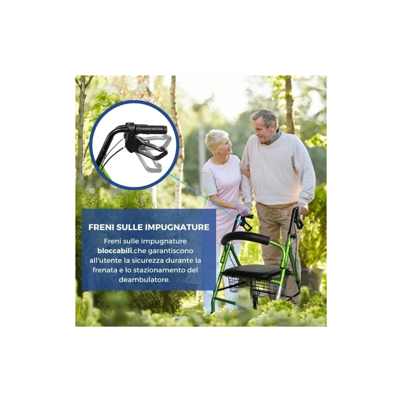 Le maniglie del girello con sedile sono ergonomiche e aiutano a distribuire e ammortizzare il peso, riducendo l'affaticamento durante l'uso. Inoltre, includono freni ad attivazione graduale per fermare il deambulatore al momento giusto e senza sforzo, sebbene offra anche la possibilità di lasciarli bloccati per garantire l'immobilizzazione del deambulatore, ad esempio, quando si è seduti sul sedile. Se il deambulatore deve essere completamente immobilizzato, le leve dei freni devono essere tirate verso il basso e le ruote saranno completamente bloccate.