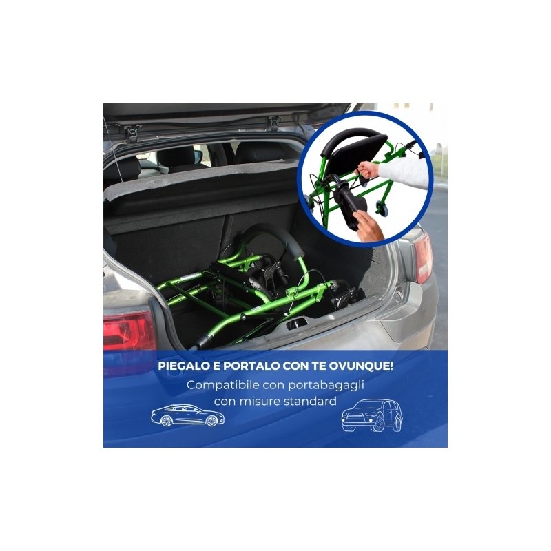 PIEGHEVOLE: questo ausilio tecnico è pieghevole, quindi è possibile riporre il deambulatore per adulti nel bagagliaio dell'auto senza problemi, o anche riporlo senza occupare troppo spazio.