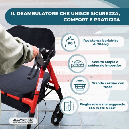 Il deambulatore bariatrico Madeira Mobiclinic è progettato per offrire la massima stabilità, resistenza e comfort . Con una capacità di carico fino a 204 kg , supera di gran lunga i modelli standard (100-120 kg), rendendolo ideale per utenti in sovrappeso o per chi cerca maggiore sicurezza negli spostamenti.