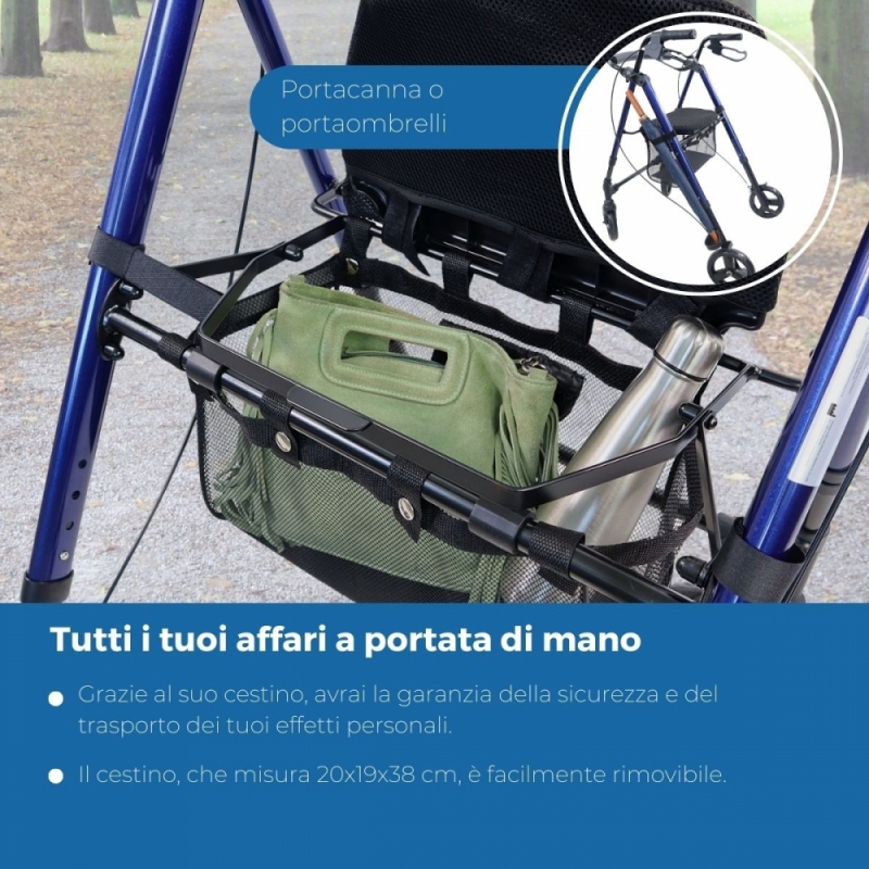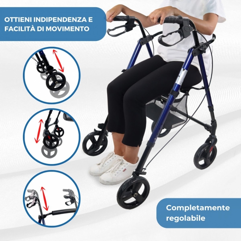 FORNISCE AUTONOMIA: questo deambulatore per anziani e disabili permetterà loro di avere maggiore autonomia in completa sicurezza grazie ai freni a leva e al suo ampio cestino, oltre alle ruote, che consentono una rotazione totale fino a 360º.