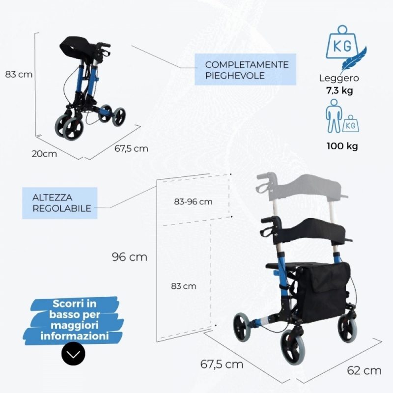 Caratteristiche tecniche del deambulatore pieghevole: