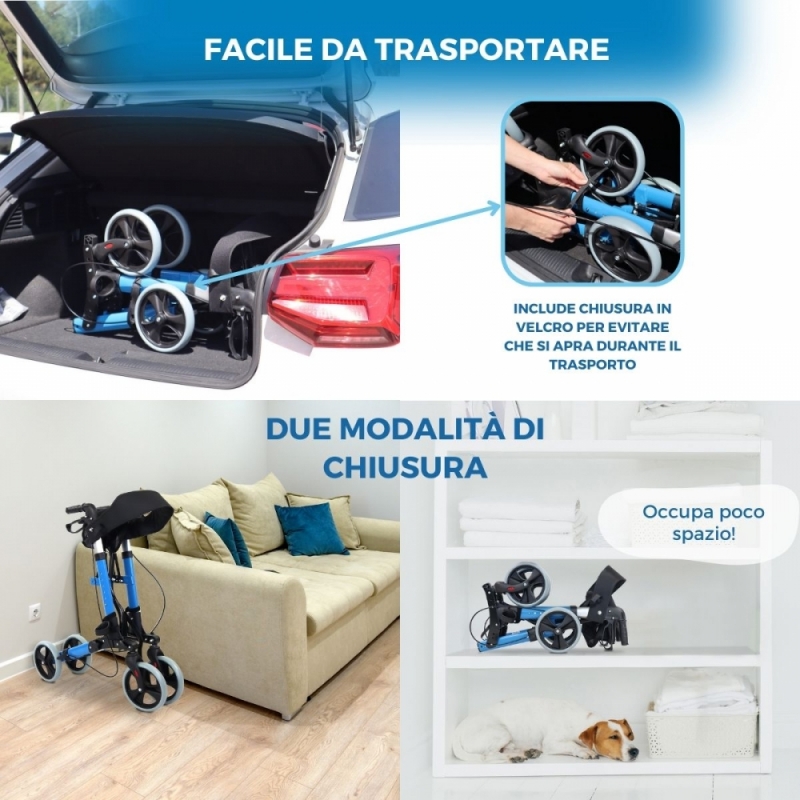 PORTE E BAULE : questo deambulatore ha una larghezza totale di 58 cm, quindi può passare attraverso porte di larghezza standard di 62,5 cm. Inoltre, poiché questo deambulatore piegato misura solo 25 cm, può essere trasportato nel bagagliaio di un veicolo tipo Volkswagen Polo. Assicurati delle misure delle tue porte e del tuo veicolo per verificare che si adatti a te.