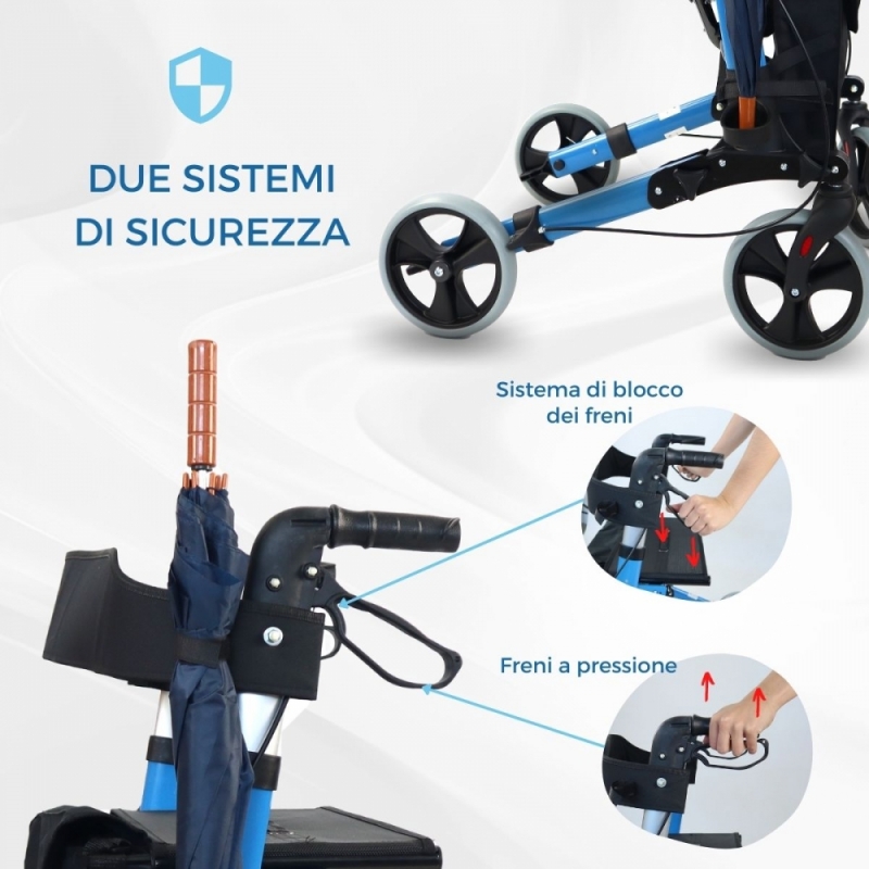 BLOCCAGGIO: Se è necessario immobilizzare completamente il deambulatore, è necessario tirare le leve dei freni verso il basso e le ruote verranno bloccate. Per sbloccare è necessario tirare le maniglie verso l'alto.