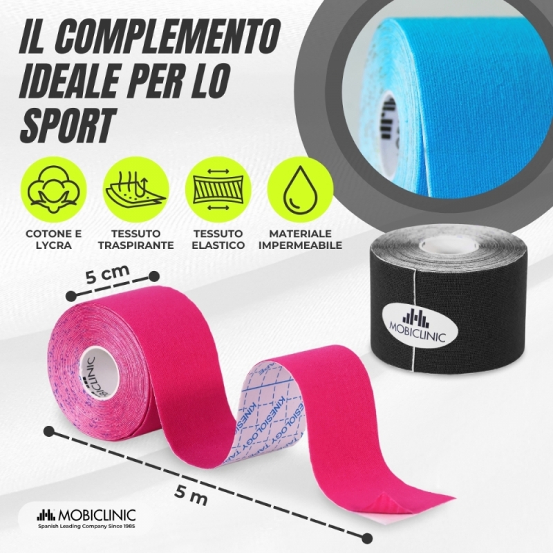 Il bendaggio kinesiologico è ideale per trattare infiammazioni, dolori muscolari e migliorare la circolazione. Tutto questo grazie alla resistenza e alla traspirabilità fornita da un prodotto realizzato in 97% cotone e 3% elastan.