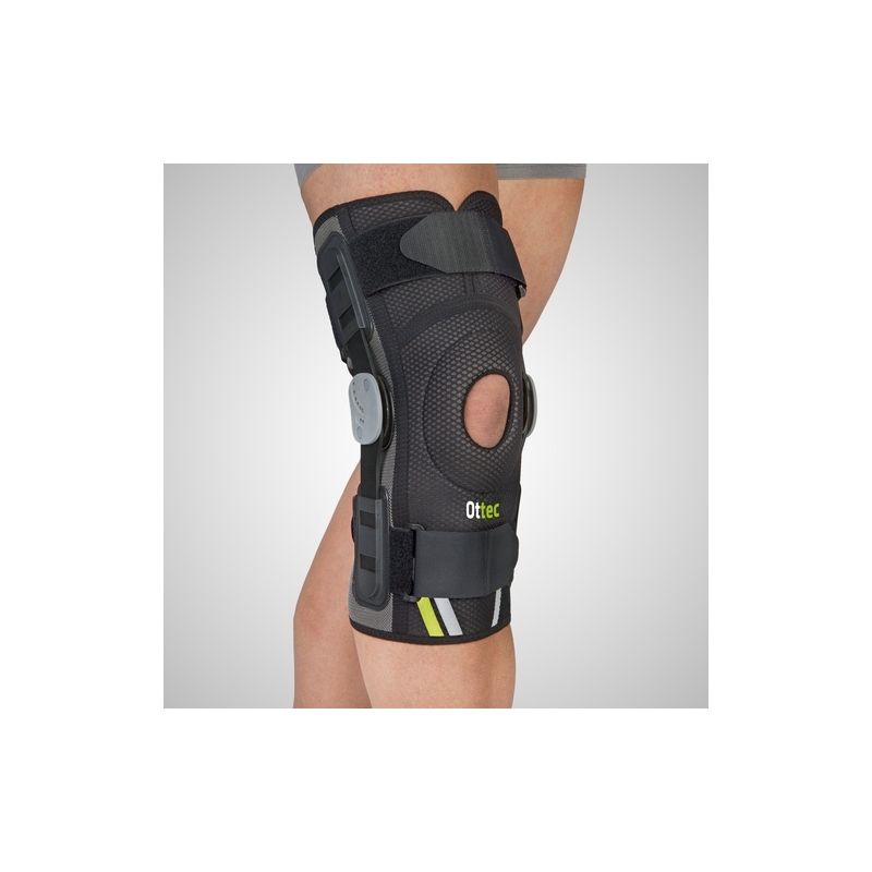 Regolazione tramite fasce in velcro per favorire la stabilizzazione. Aperto davanti e in alto. Girante in materiale viscoelastico. Giunti policentrici regolabili a 0º, 30º, 55º, 75º, 95º e 110º di flessione. Sistemazione per la rotula, evitando pressioni su di essa e facilitando la flesso-estensione.