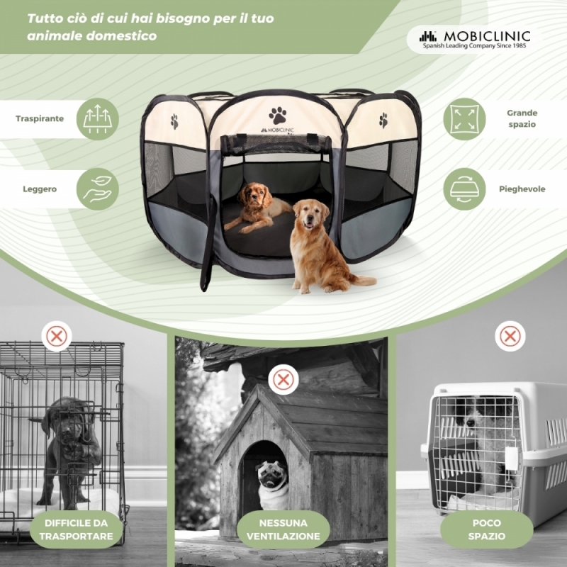 Questo box portatile offre al tuo cane uno spazio per giocare , riposare e allenarsi , non importa dove ti trovi. È molto utile quando l'animale deve riposare, così gli altri animali presenti nell'ambiente non gli daranno fastidio.