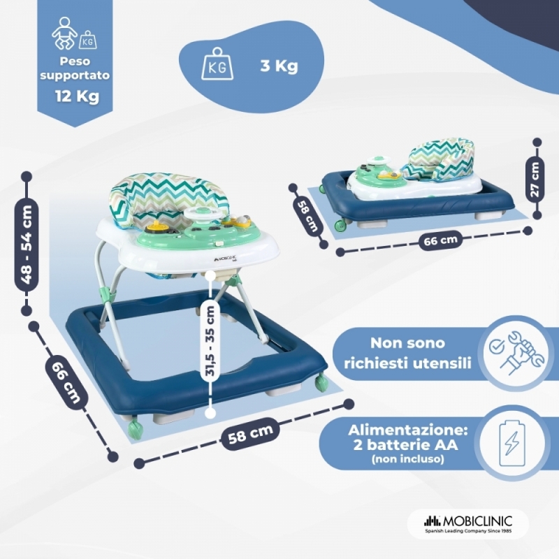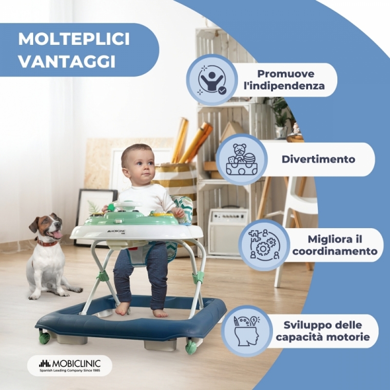 FUNZIONALITÀ: Questo girello è progettato per consentire ai più piccoli di muovere i loro prim passi in modo sicuro e divertente. Grazie alla sua struttura che fornisce stabilità e sostegno, il bambino rafforzerà le gambe e migliorerà la coordinazione durante i movimenti. La sua base garantisce un movimento equilibrato, impedendo il ribaltamento e garantendo sicurezza.