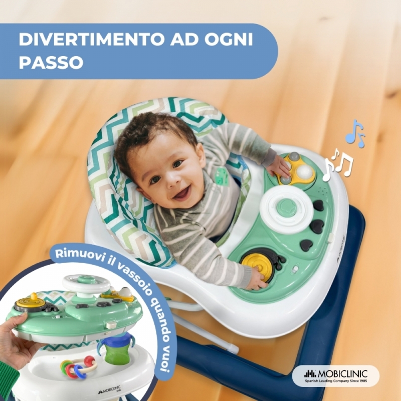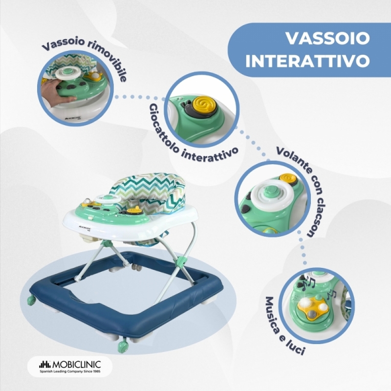 È dotato di un vassoio interattivo, dotato di tre giocattoli, luci e musica, che intrattengono costantemente il bambino mentre interagisce ed esplora. Il vassoio è rimovibile, così il bambino può giocarci separatamente, offrendogli così un'ulteriore possibilità di divertimento.